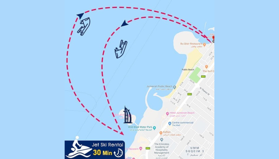 Follow our instructor on your own jet ski. From our marina, he leads the way to the famous 7 star Hotel, the Burj Al Arab. This hotel has been built on the sea, so no better way to admire it from your jet ski. You can take all the pictures you want and have proper souvenirs from one of the most symbolic building of the city. Then we head back to our marina with some nice pictures, views and having had a lot fun riding powerful jet ski (up to you to use it, everyone goes at her/his own pace) !
