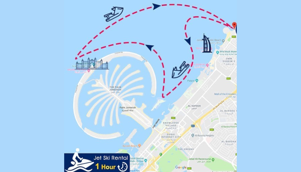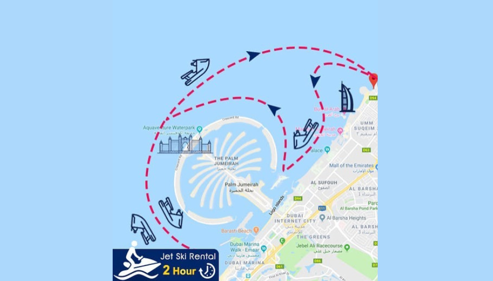 Drive your own jet ski from our marina. Our instructor leads the way on his jet ski. You head first to the famous 7 star Hotel, the Burj Al Arab, and take the time for a photo shoot from you with one of the most iconic buildings of Dubai. Then ride along the coast enjoying a beautiful view of Dubai Skyline towards His Highness Sheikh Mohammed bin Rashid Al Maktoum island. There is a high chance his Dubai Yacht is parked there. That's one of the top 5 luxurious yachts in the world. The last part of the tour takes you to the Jumeirah Beach Residence (JBR). And we all head back to our marina with a lot of visual souvenirs, photos and fun!
